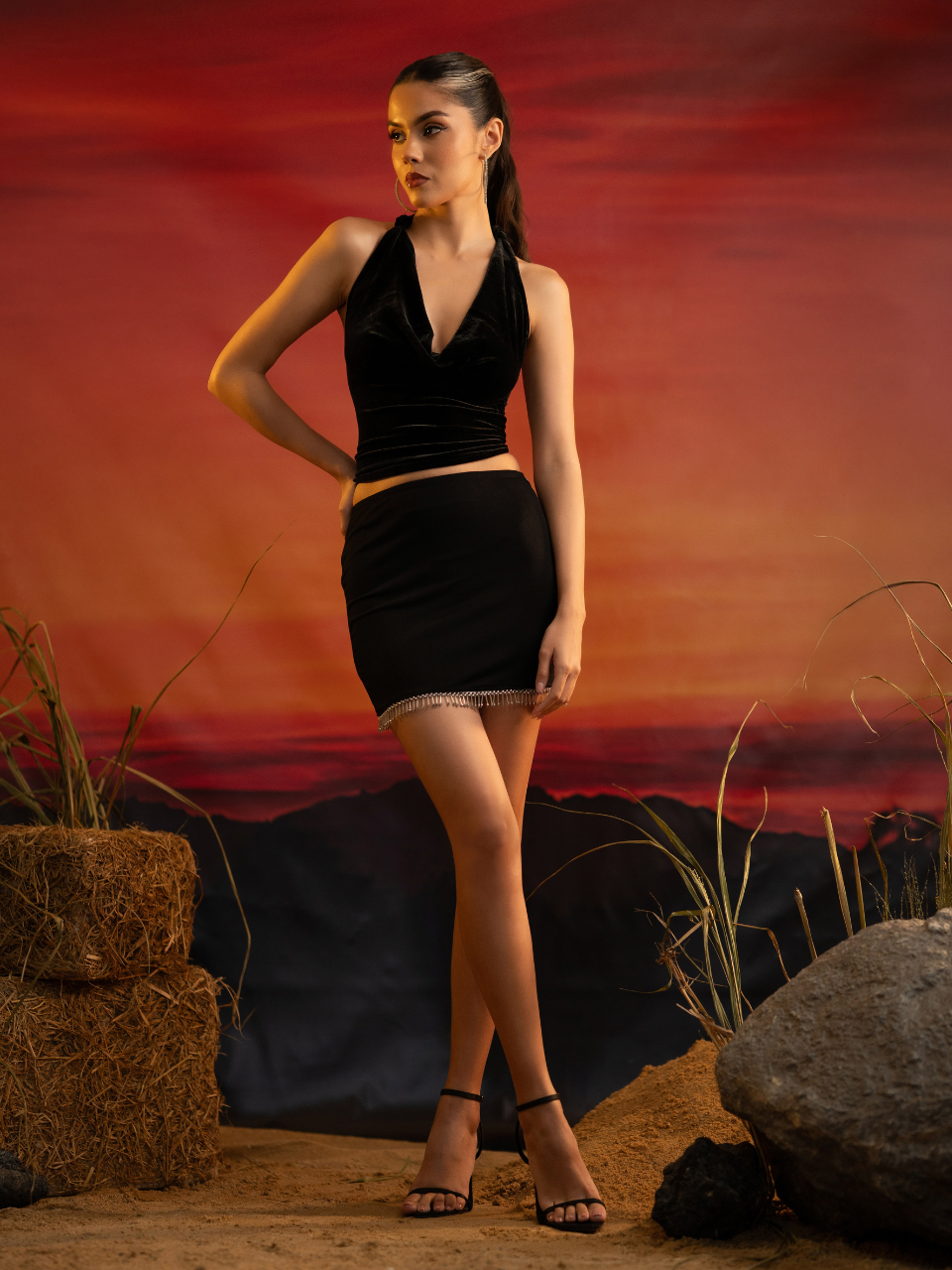 Crafted from a soft, stretch velvet, the Velvet Cowl Top features a fluid cowl neckline that drapes effortlessly along the bust. Designed with a halter tie-up for an adjustable fit, this piece includes a subtle knot detail that adds shape while keeping the silhouette minimal and refined. Elegant, versatile, and flattering, it pairs seamlessly with both evening and resort looks, a timeless staple with a touch of understated allure.